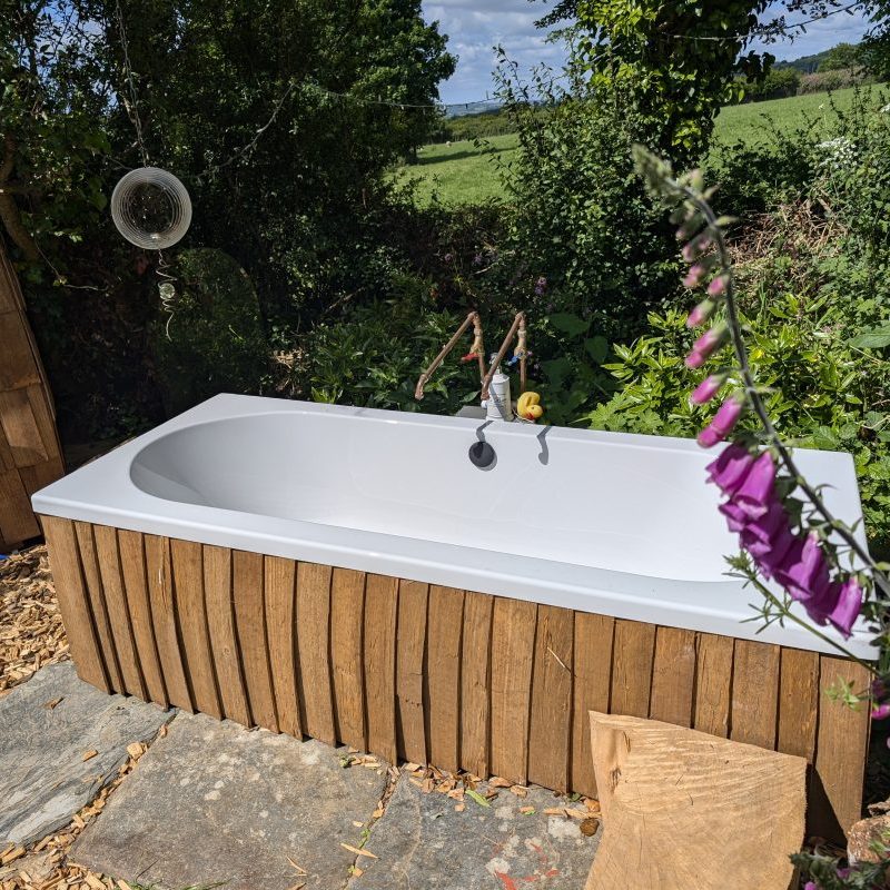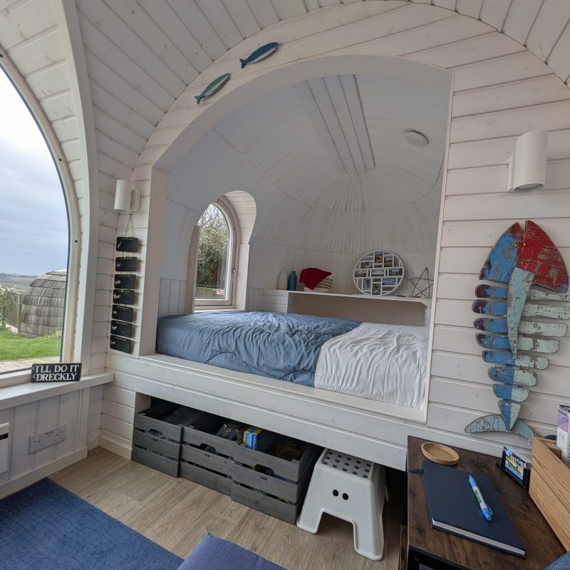 Dreckly has an extra large window to make the most of the sea views, and boasts it’s very own ‘secret garden’ with sunset viewpoint in a little woodland clearing, now with brand new outdoor tub for hot or cold soaking.